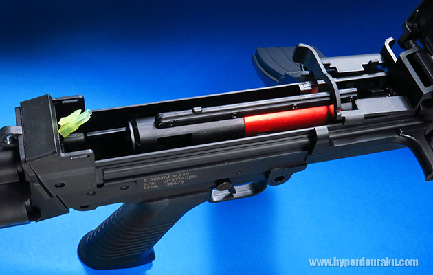 リアサイトの下にある両側のロックを押して引き上げれば、フィードカバーを開けられます。本体内部にはメカボックスが収納されています。メカボックスの後部がバッテリースペースになっています。