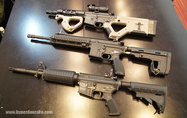 今回伺ったのは埼玉県蕨市にあるシステマコーポレーション。応接室のテーブルに置かれた3丁のトレポン。一見してノーマルのM4カービン、そしてNBORDEのカスタムレシーバーのHK416、HERA ARMSのカスタムストックを組み込んだ3丁のARが置かれていた。