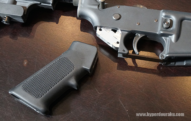 もともとPTWはロアレシーバーの外形がリアルサイズなのが特徴だが、グリップ内にモーターを配置する関係上、写真上のようにグリップ取り付け部にモーターの軸とピニオンギアが入る構造になっている。