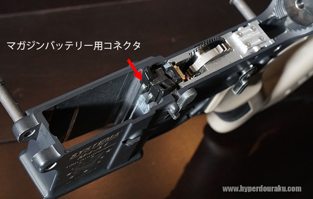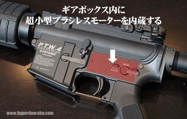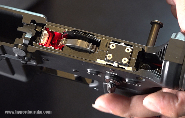 この薄いリアルサイズのPTWのロアレシーバーには従来と同じサイズのギアボックスがあるのだが、このギアボックスにモーターが内蔵されている。