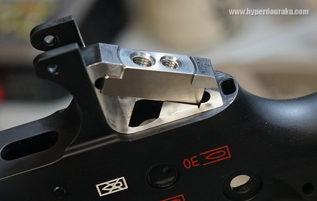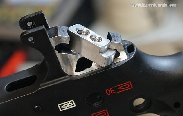 こんな感じで美しく加工された。これにMOVEオリジナルのステンレス製ネジ穴パーツをセットする。今回グリップはMAGPULのMOE K2を取り付けてみた。