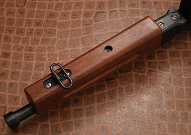 ハンドガードも木目調のプラ製。マルイの木目調ストックは良く出来ていると思う。こだわる方はCAWから木製ストック(\24,990)が発売されているので交換してみては。しかし重くなること必至。