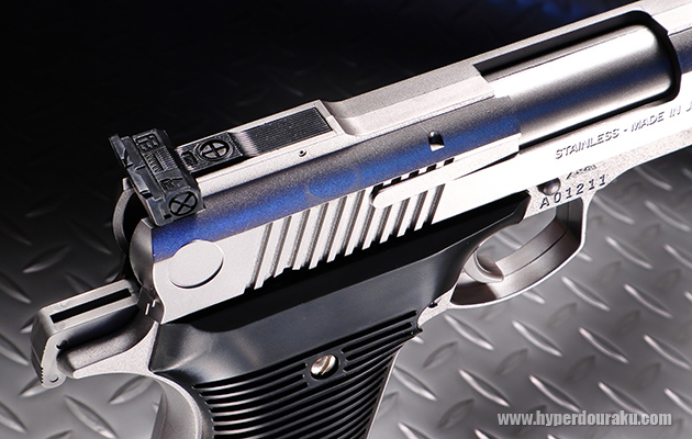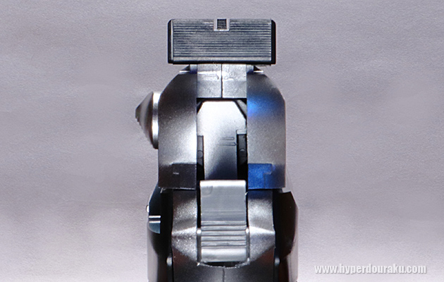 ハンマーはスライドのコッキングに連動して起き上がるが、指でこれだけを起こす事は出来ない。素晴らしくリアルに造形されたミレット社のターゲット・タイプ・リアサイトは思わずネジで調整したくなるが一体成形パーツ。エクストラクターも金型モールドによる表現だが、やや斜めに向いていて最高にリアル。塗装や表面仕上げによる「ステンレス感の演出」が素晴らしい。