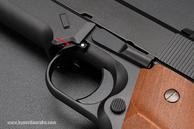 ホップアップ調整やメンテナンスの際のストライクプレート着脱はトリガーガード前のスイッチで行う。この白いドットマークは蓄光塗料が使われている。