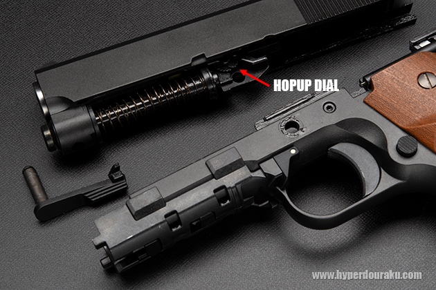 デトニクス同様にスライドストップピンを抜いて、スライドを取り外せば可変ホップアップの調節ダイヤルにアクセスできる。