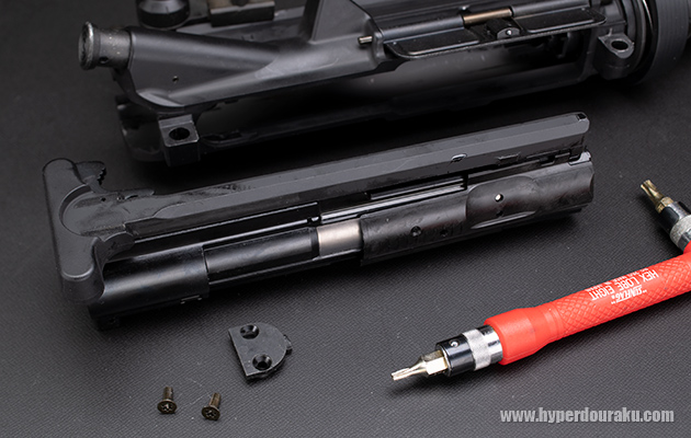 2本のトルクスネジを抜けば半円形の固定パーツが外れ、チャージングハンドルとシリンダーユニットが引っ掛かりもなくスルッと引き出せる。