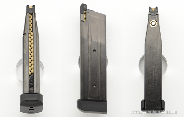 マガジンは従来のハイキャパシリーズと共用できる。装弾数31発で亜鉛ダイキャスト製、リップからも、前面のスリットからも装填可能だ。ハイキャパのマガジンは装弾数もさることながら大容量でもあるので、安定した射撃に定評がある。