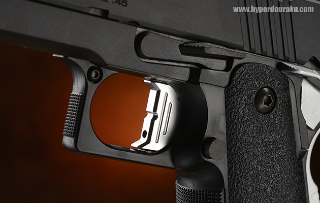 フラットタイプのトリガーは樹脂製でシルバーメッキ。シングルアクションオンリーのトリガープルは約400gと軽く、ストレートに引けてストロークも短いのでとても撃ちやすい。ハイキャパの人気の理由の一つがここにある。従来の5.1より100gほど軽い。