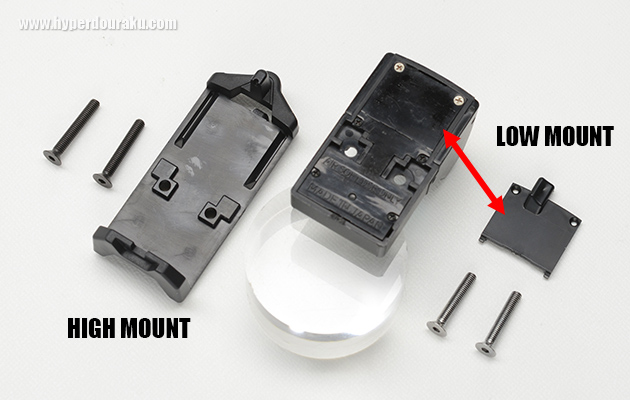 ハイマウントは付属の少し長い黒いネジ、ローマウントは電池蓋を詰めのある付属パーツに交換し、少し短い銀色のネジを使用して取り付ける。とくに電池蓋のネジはとても小さいので紛失には注意しよう。