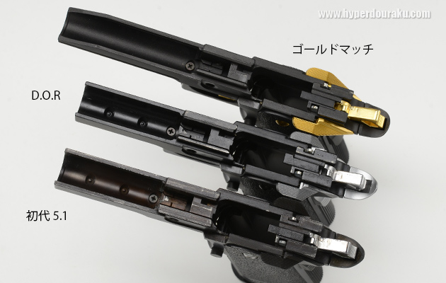 シャーシ側の基本形状はゴールドマッチと同様。ゴールドマッチ、5.1のスライドはDORに搭載でき、撃つこともできた。逆にゴールドマッチやDORのスライドは5.1には搭載できない。