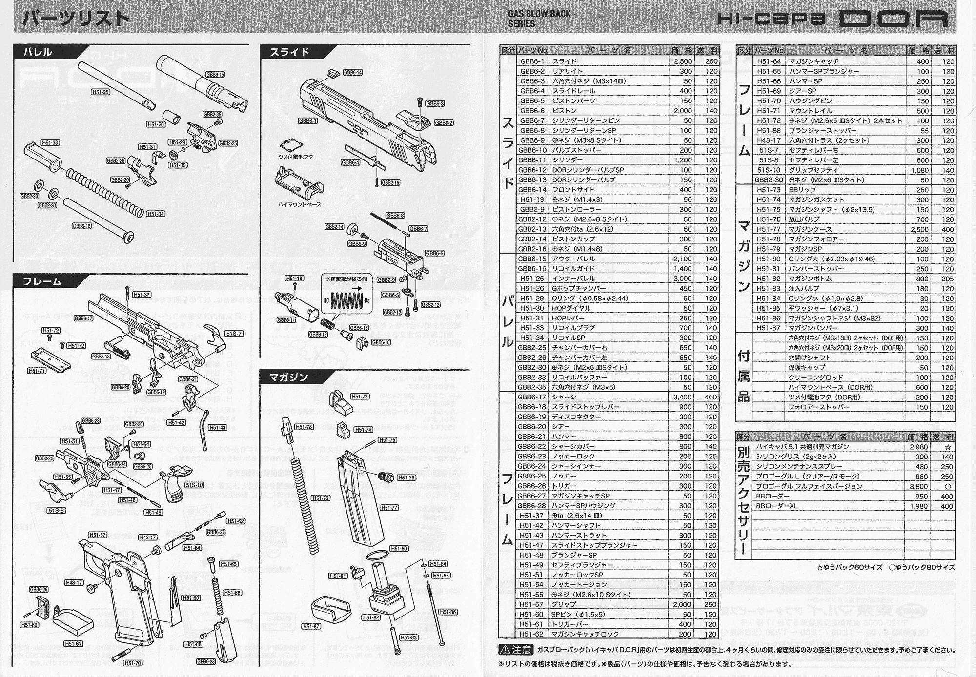パッケージ内容は、ハイキャパ D.O.R本体、マガジン、ローマウント用ツメ付電池フタ、ローマウント用ネジ×2、ハイマウント用マウントベース、ハイマウント用ネジ×2、マウントレイル 、取付ネジ×2、取付穴加工治具、保護キャップ、取扱い注意・説明書、注文書、クリーニングロッド、BB弾少々。