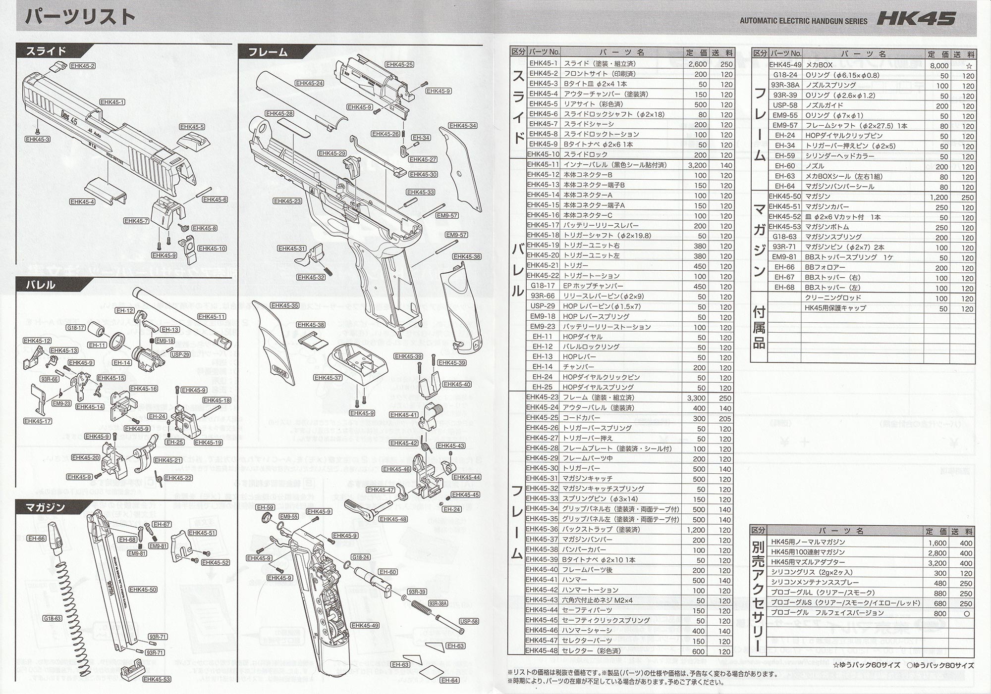 パッケージ内容はHK45本体、マガジン、保護キャップ、取説、クリーニングロッド、BB弾少々。