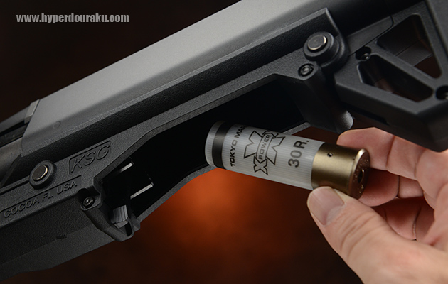 シェルマガジンは銃に対して右側のチューブに装填するが、奥まった位置にあり、マガジン交換の操作方法はかなり面倒。スプリングテンションが効いているのでリリースレバーを押すとストンとシェルが飛び出してくるがローディングポート内に引っかかったり、勢い余ってシェルを落としてしまったりする。