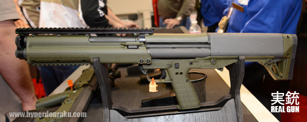 実銃のKSGはアメリカの銃器メーカー、Kel-Tec社が開発したショットガンで2011年に発表された。機関部をトリガーより後方にレイアウトした"ブルパップ"と呼ばれる独自のスタイルが採用される。長いバレルでも全長を短く抑えることができるのがブルパップ式の利点で、ショットガン以外にもアサルトライフルや、スナイパーライフルでも採用される。