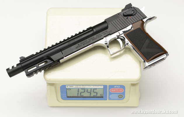 命中精度は9mでスタンディングで撃っても5cmにまとまる十分な精度がある。しかしそのパワフルな反動を確実に受け止めつつ、1.2kgの重量をしっかり支えながら撃たねばならない。容易に連射できないところも.50口径のマグナムハンドガンといったところだろうか。