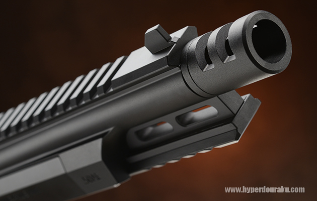 バレル下にもピカティニーレイルが装備され、ウエポンライト等を搭載することができる。バレル固定なのでバーティカルフォアグリップを搭載しても面白いかも。※強く握りしめて破損しないよう注意が必要。