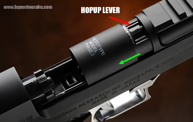 スライドをホールドオープンさせ、チャンバー上部のカバーを引けば可変ホップアップの調節レバーにアクセスできる。スライドを外さなくても調整できるので便利。