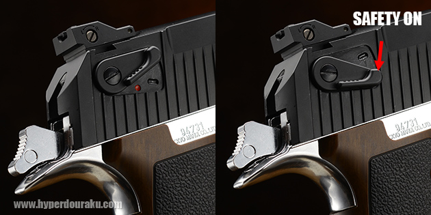 確実な操作が可能な新形状のカスタムセフティレバー。レバーを押し下げればトリガーとスライドがロックされ、安全装置が掛かる。セフティオン時にスライドが動かなくなるのは嬉しい機能。