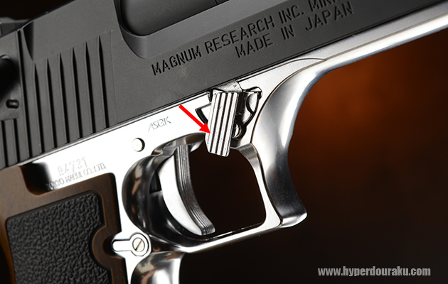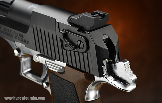 ホールドオープンすればバレルは動かずに後部のスライドのみが後退する仕組み。実銃のデザートイーグルでもあるロッキングラグもリアルに再現される。