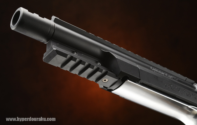 スライドトップにはピカティニーレイルを装備し、ドットサイトなどの光学照準器が搭載できる。