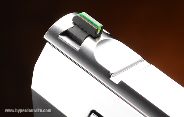 フロントサイトは上が角型のグリーン集光アクリル、下が蓄光タイプのコンビネーションサイトが採用されている。