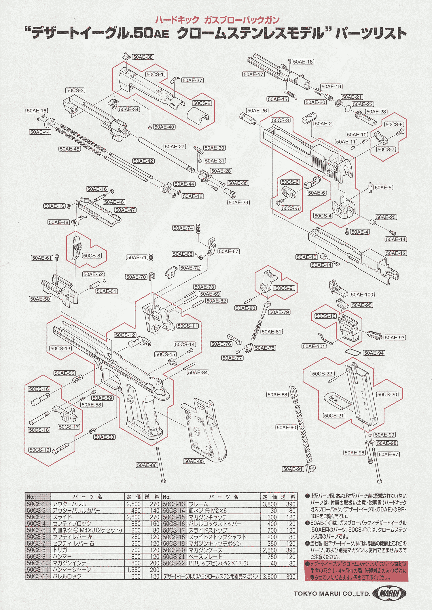 パッケージ内容は、本体(10インチバレルスライド付き)、6インチバレルスライド、マガジン(装弾数27発)、弾薬箱、保護キャップ、取扱い注意・説明書、解説書、補足説明書、クリーニングロッド、他。