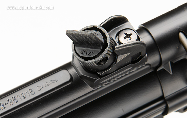 全国1千万のMP5ユーザー憧れの、ロック状態から手のひらでスパンと叩いてロック解除する「HKスラップ」もできる。ノブは実銃同様に樹脂製で、軸は金属製、フロントチューブセクションはアルミ製だが、ノブが引っかかる部分は亜鉛ダイキャスト製で繰り返しスラップしても問題ないそうだ。