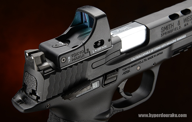 気温23度の室内で射撃したところ、ビシバシとリコイルが強く、切れも鋭い。しかもマイクロプロサイトを搭載して射撃してもリコイルが衰えることなくガンガン作動する。C.O.R.E.搭載のドットサイトは後付け感がなく、デザイン的にも美しい。