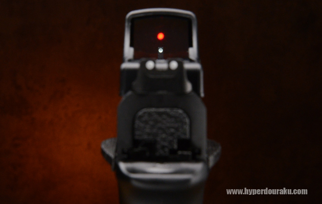 ドットサイトを取り付けてもアイアンサイトも使用できる。フロントサイトの少し上にドットが光る。
