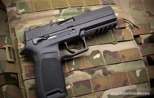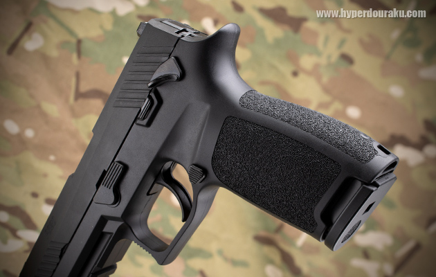 実銃のSIG P320はSIG SAUER社が開発したストライカー式のポリマーフレーム・オートマチックピストル。弾薬は9mm×19を使用し、米陸軍の新拳銃トライアル(MHS)にXM17として参加、2017年1月にトライアルを勝ち抜き、ベレッタ社のM9に代わり米陸軍制式拳銃の座を奪った。