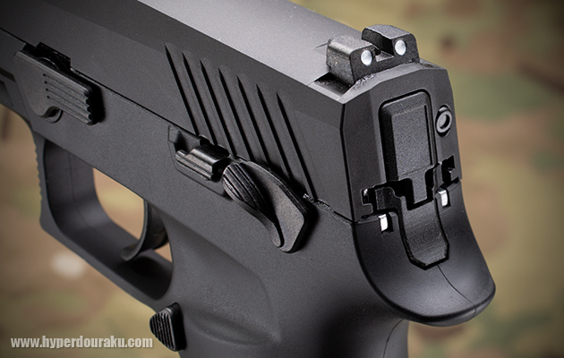 フロント、リアサイトにはホワイトドットが入る。またスライドリアキャップやエキストラクターSPガイドは金属製の別パーツとなっていて、こだわりの質感だ。