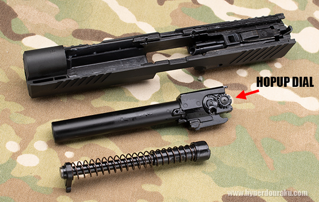 スプリングガイドとバレルアッシーを取り出してみる。可変ホップアップダイヤルはチャンバー左横にあり、分解せずともホールドオープンしてチャンバーから指で操作できる。