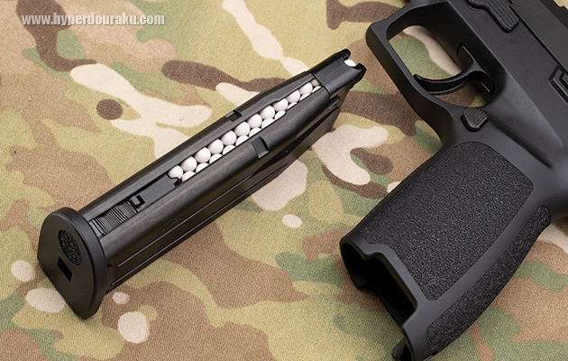 マガジンは亜鉛ダイキャスト製で装弾数は26発。マガジンバンパー底部には本来SIGのエンブレムが入るが滑り止めのテクスチャとなっている。