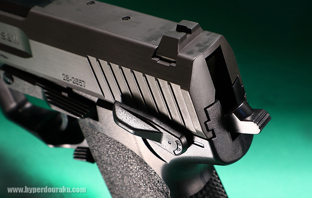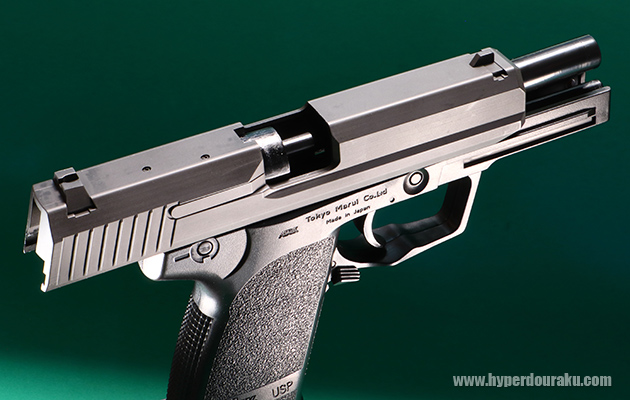 また、左右両用できるように工夫されたパドル式マガジンキャッチや、片手でも操作しやすいスライドリリース・レバーなど、保守的なレイアウトながらも使い勝手を追求した実銃USPの機能美が卓越した造形技術で美事に再現されている。