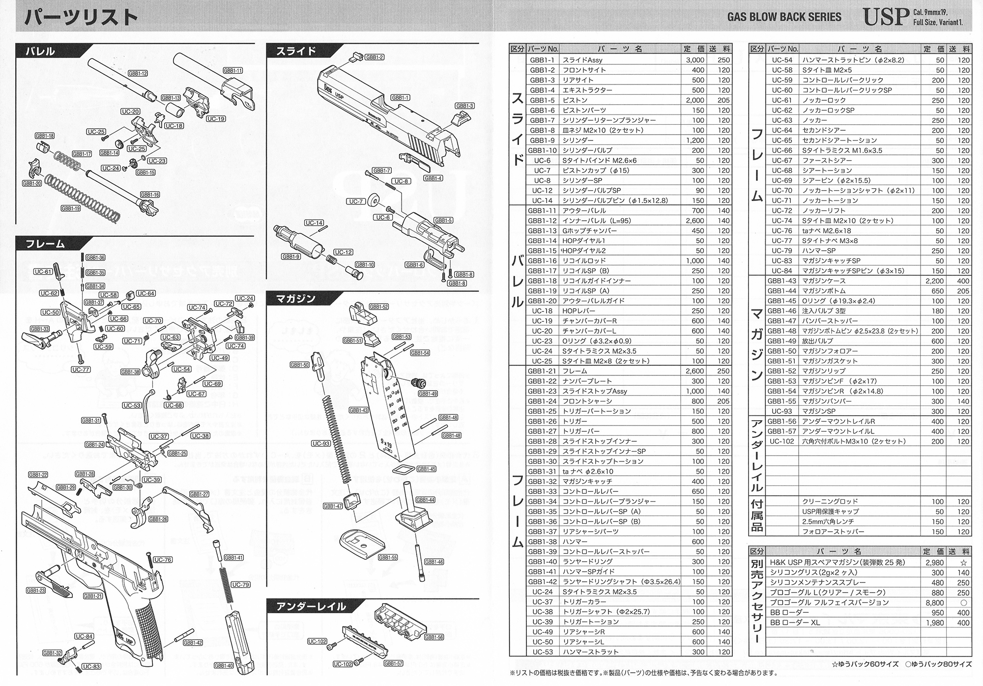 パッケージ内容はUSP本体、マガジン、アンダーマウントレール、保護キャップ、フォロアーストッパー2個、クリーニングロッド、取説、パーツリストとBB弾100発。