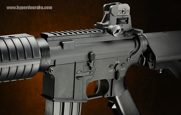 ハンドガードはプラ製のものが装着される。太目のクーリングホールが7つのM4A1カービン然としたものだ。
