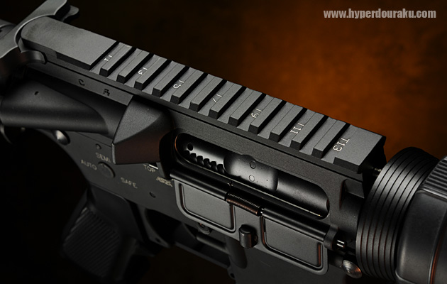 レシーバー右側面。レシーバーはアッパー&ロアともにアルミダイキャスト製。電動ガンにしては造型の深いボルトキャリアが印象的。これが射撃時にはフルストロークで前後し薬莢を排出する。まさしくライブアクション!! 夢の電動ガンたる所以である。