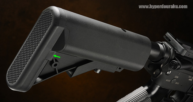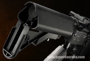 ストックチューブの太さは28.6mmなのでミリタリースペック互換。東京マルイM4用のストックや実銃用のミリタリーストックなどが取り付け可能。