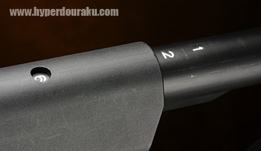 ストックチューブ上面には伸縮ポジションの数字が印刷されており、ストック上部の穴から現在どのポジションになっているかがわかる。