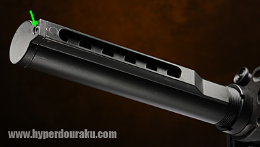 ストックチューブ(リコイルバッファチューブとも)の後端に六角ネジがあるのでこれを取り外してバッテリーを取り付ける。