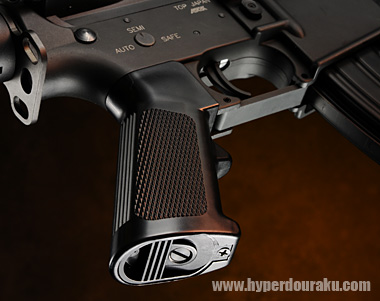 グリップはフィンガーチャンネルのあるA2タイプ。このグリップ内にモーターを内蔵するのは東京マルイの電動ガンと同様。