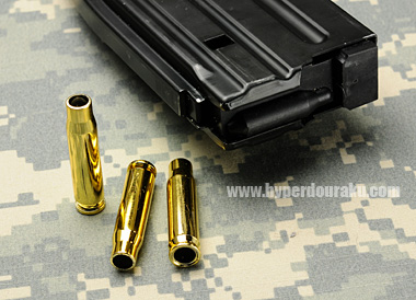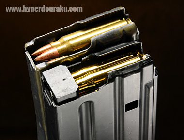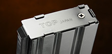 マガジン装弾数は30発。まさしくリアルカウントだ。上が実銃のマガジンにダミーカートを入れたもので、下がトップのマガジン。よく似ているがTOPは安全上の配慮からあえて形状を変更して実銃のマガジンを使用できなくしている。