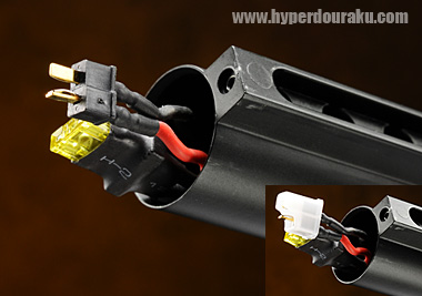 ストックチューブのフタを開けてバッテリーコネクタを引き出す。コネクタはT字形状で東京マルイのコネクタとは異なる。