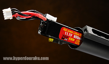 ここに専用の11.1V 850mAhのリチウムポリマーバッテリーを装着する。ノートPCや携帯電話などでも利用されている、いわゆるリポバッテリーだ。3.7Vの3セル構造。