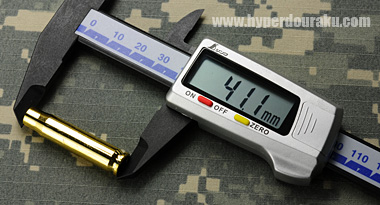 5.56mm×45弾のダミーカートリッジとの比較。カートの太さはほぼ同じだが、ネックの絞込みから先は6mmBB弾をくわえ込むのでTOPのほうが太い。またカート長はTOPのほうがやや短い。