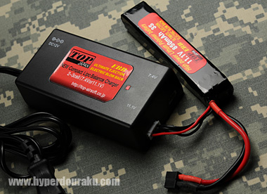リポバッテリーは充電用のコネクタと銃本体に繋ぐ放電用のコネクタが分かれている。