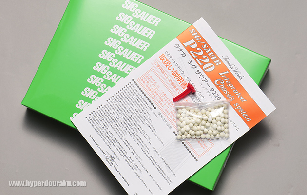 ライトグリーンで「SIG SAUER P220」とホップなデザインです。サイドに「陸上自衛隊 9mm拳銃」とラベルが貼られており、モデル名がわかります。パッケージサイズは265 x 180 x 50mmです。