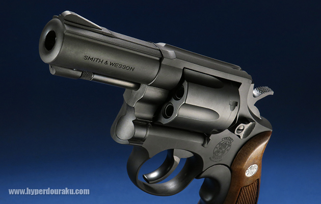 .38口径から.357マグナム弾に強化されたため、シリンダーがM10より延長されています。左面のサムピースの下にはS&Wの打刻によるロゴ、右面にはレーザーによるメーカー刻印が入っています。またフレーム素材はHWウェイト樹脂ですが、右面のパネルとシリンダーは金属製で、仕上げも以前のような単なる黒染めではなく、メッキを使用した美しい仕上がりとなっています。