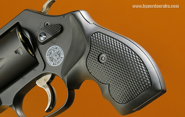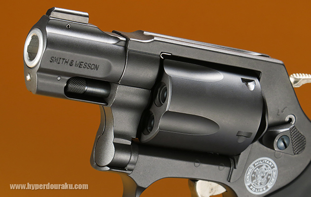 バレルはスカンジウム合金製のシュラウドとステンレス鋼製のライナーによる2ピース構造を再現しています。バレル右側には「SMITH & WESSON S & W.38 CAL.」と.38口径表示となっています。