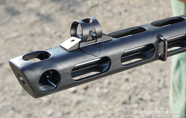マズルブレーキを兼ねたバレルジャケット。上部にはガード付きのフロントサイト。左側面にはスリングスイベルがある。